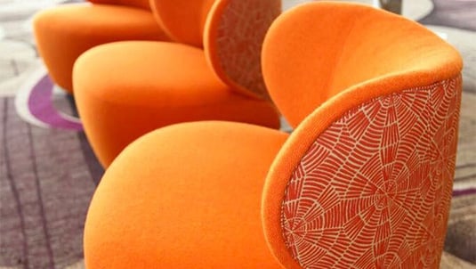 High performance fabrics with “Iroquois” pattern from Mokum were used on lounge chairs at the new Terminal 4 departure lounge. Three vivid colours, Vermilion, Peacock and Copper were used on different styles of chairs spread around the terminal.